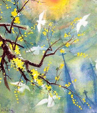 Én liệng cành mai hoa đón xuân